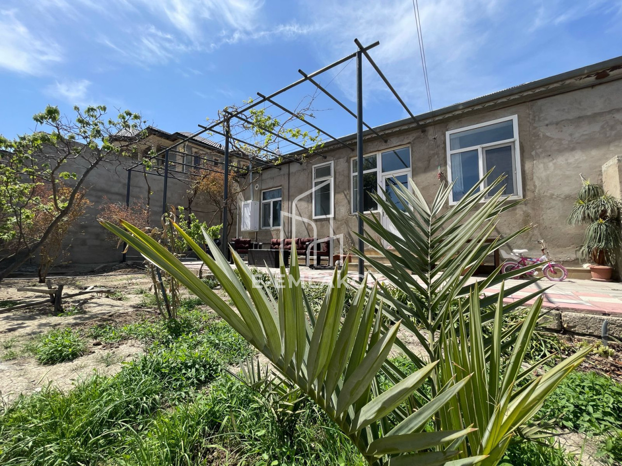 Həyətdə müxtəlif meyvə və dekorativ ağaclar var. Bundan əlavə, 4 tonluq dəmir su çəni, geniş qaraj, əl damı və həyət üçün ayrıca sanuzel mövcuddur. Evin podvalı kifayət qədər hündürdür və rahat hərəkət etmək mümkündür.